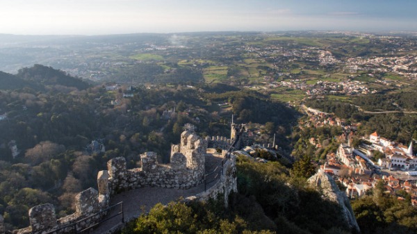 The Moorish Castle is situated on one of the highest peaks of the Sintra Hills, offering panoramic views of the Atlantic Ocean and surrounding landscapes.